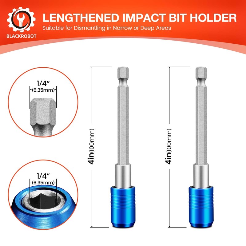 BLACKROBOT 2-Piece Magnetic Quick Change Impact Bit Holder, 4-Inch Long Drill Bit Extension for 1/4" Hex Drives, Ideal for Screwdriver Bits, Nuts, Drills and Socket Driver Adapters