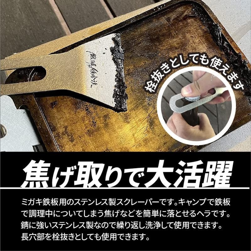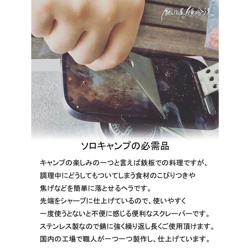 - This is a stainless steel scraper for blacksmith's Sainainhan Migaki Iron Plates. This spatula can easily remove burns from cooking on a griddle while camping. This handy camp burnt scraper feels inconvenient after you use it