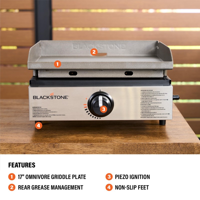 The Original Series 17" Table Top Griddle from Blackstone features a 267 square inch cooking surface with easily controlled cooking zones with a powerful 12,500 BTU output single stainless Steel H burner. Its classically styled profile offers a patented rear grease management system. Low maintenance stainless steel front panel. Piezo ignition.