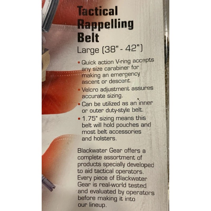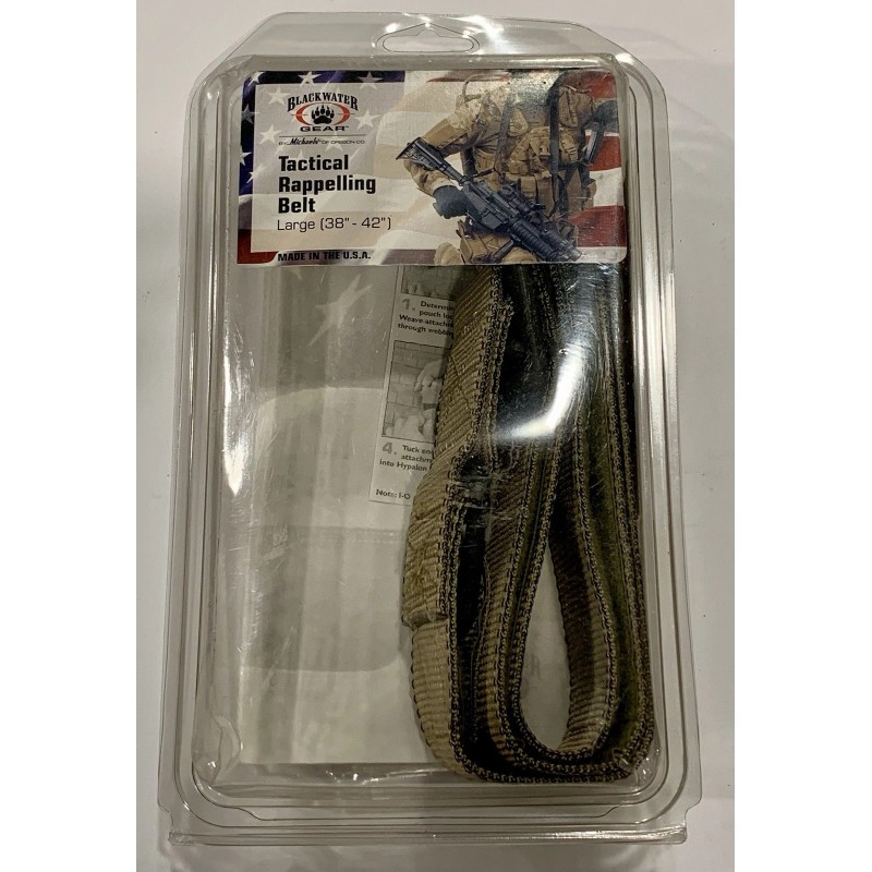 Brand new in the plastic box Blackwater Gear 1-3/4 Nylon Khaki Tactical Utility Rappelling Heavy Duty Belt, Size Large. Fits waists from 38-42”. Ships from a pet and smoke free home. Thanks