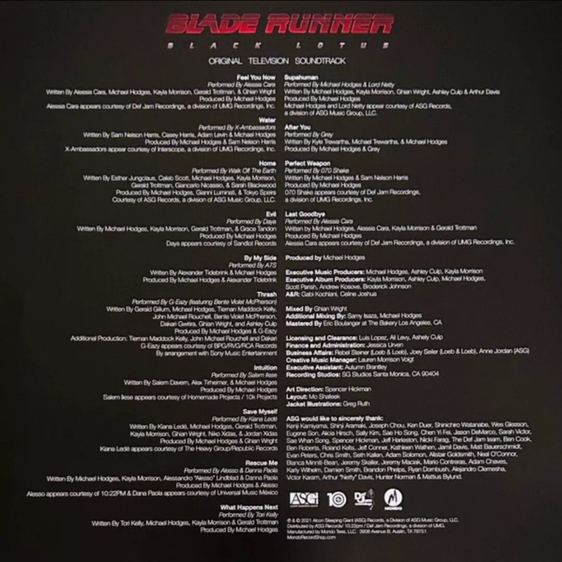 "Mondo, in partnership with ASG and Def Jam Recordings, is proud to announce the premiere vinyl release of the highly anticipated anime series BLADE RUNNER: BLACK LOTUS soundtrack featuring fifteen original tracks from X Ambassadors, Iann Dior, 070 Shake, Alessia Cara, G-Eazy, Tori Kelly, Alesso & Danna Paola, A7S, Daya, Kiana Lede and many more.