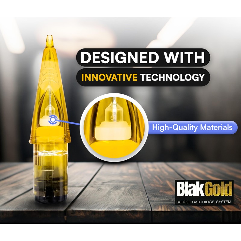 BlakGold cartridges are designed so the needles glide flat against the base of the tip; this prevents any twisting, bending, or instability during tattoo procedures which allow maximum precision. BlakGold cartridges are also made of medical-grade plastic housing, which helps reduce friction between the needle grouping and the tip. The surgical steel needles are razor-sharp and designed with utmost precision for every configuration.