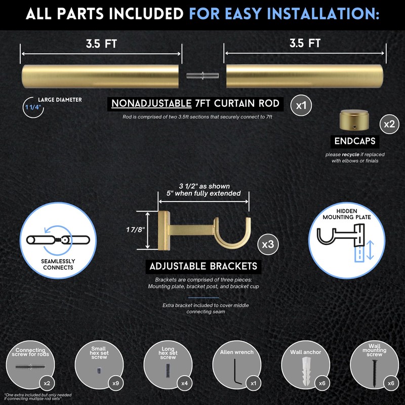 - Contemporary Brushed Gold Finish: Our heavy duty steel rods are brushed and electroplated for a stylish finish that fits well in any classic or modern room; all of our Signature Collection rods come with a full rod set and end caps, customize your look with finials, tie backs, rings and more (sold separately)