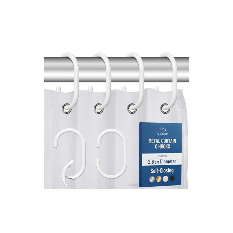 Blau Marité 12 Metal Shower Curtain Hooks, Rust-Proof Decorative C-Shaped Curtain Hooks for Bathroom, White Shower Curtain Rings, Fits Rods Up to 2,6 cm (C, White)