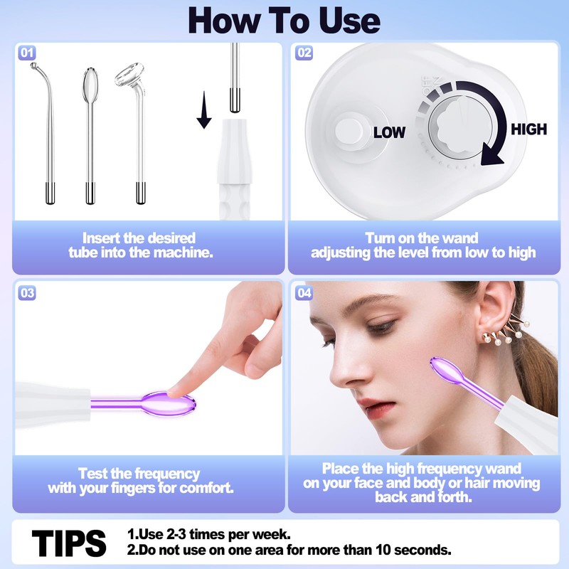 • Adjustable energy level: the high frequency wall face wand comes with 4 attachments: mushroom, comb, tongue and bending tube. Use with skin care products for better absorption and effect.