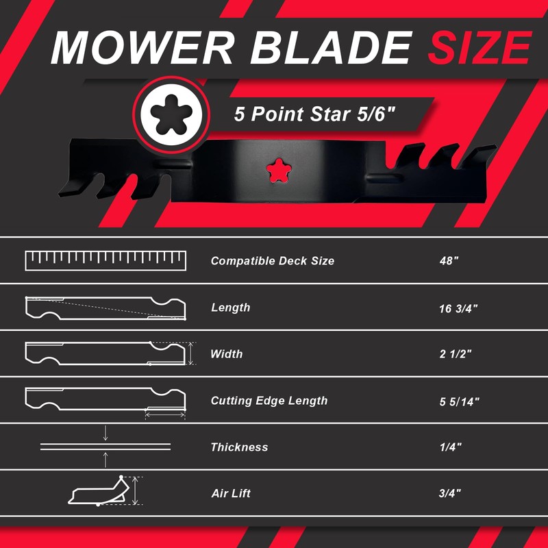 - Mower Blade Size: Length 16 3/4",Width 2 1/2",Cutting Edge Length 5 1/4",Thickness 1/4" ,Air Lift 3/4",5 Point Star Center Hole