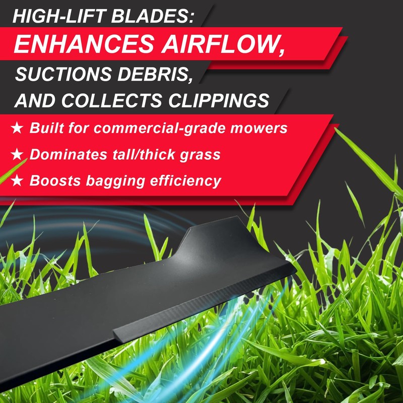 • High Lift Mower Blades:Our high-lift mower blades feature an aerodynamic vertical angle that maximizes airflow efficiency, specializing in superior grass bagging and swift clipping discharge. Eliminate frustrating clogs in discharge chutes and achieve consistently even cuts with every pass. Built to withstand rigorous use while maintaining cutting excellence - upgrade your mowing experience with blades that deliver lasting power and precision