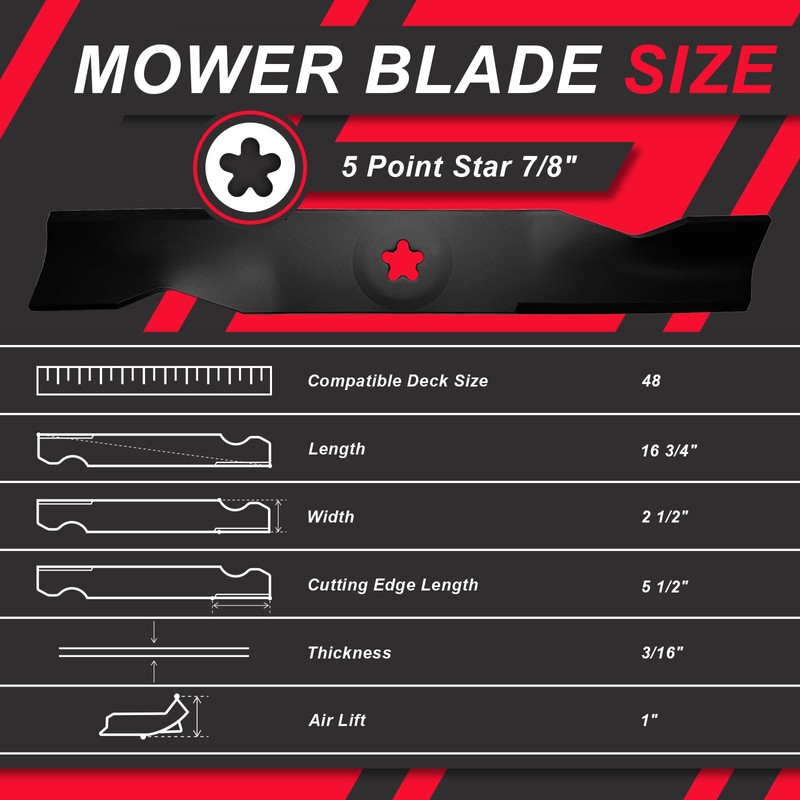 • Mower Blade Size: Length 16 3/4",Width 2 1/2",Cutting Edge Length 5 1/2",Thickness 3/16",Air Lift 1"
