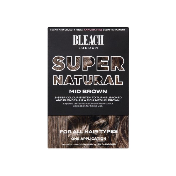 What it does Medium Brown Super Natural kit is a two-step system that follows in-salon colour correction theory to deliver a multidimensional medium brown. The first step adds vital warmth back into bleached strands, while the second step creates a rich medium brown finish that's smooth and silky soft. Formulated with Sea Buckthorn and Red Algae to restore hair health and strengthen strands. Who it's for Anyone who has bleached hair and wants to go back to a natural shade. This product can also be used to cover faded pastel colours, balayage or highlights.