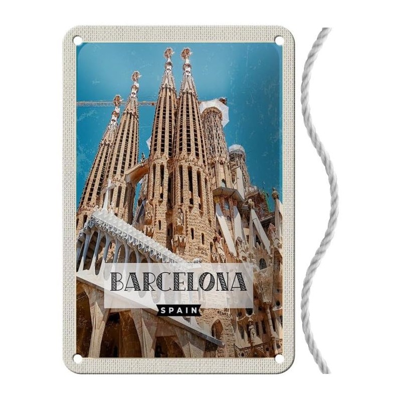 Blechschild mit Kordel 18 x 12 cm Spanien Spain Reise Urlaub Schild: Retro Barcelona Reiseziel - Blechemma