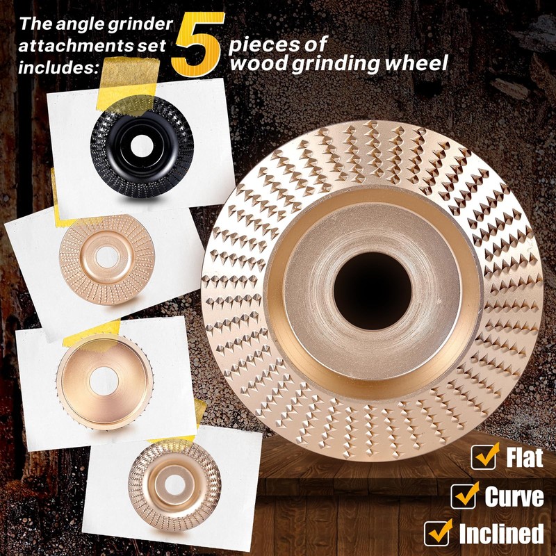 BLEKOO 5PC Angle Grinder Wood Carving Disc Set, for 4" or 4 1/2" Angle Grinder with 5/8" Arbor, Wood Shaper Carving Disc for Angle Grinder Attachments, Stump Grinder Teeth, Wood Shaping Tools