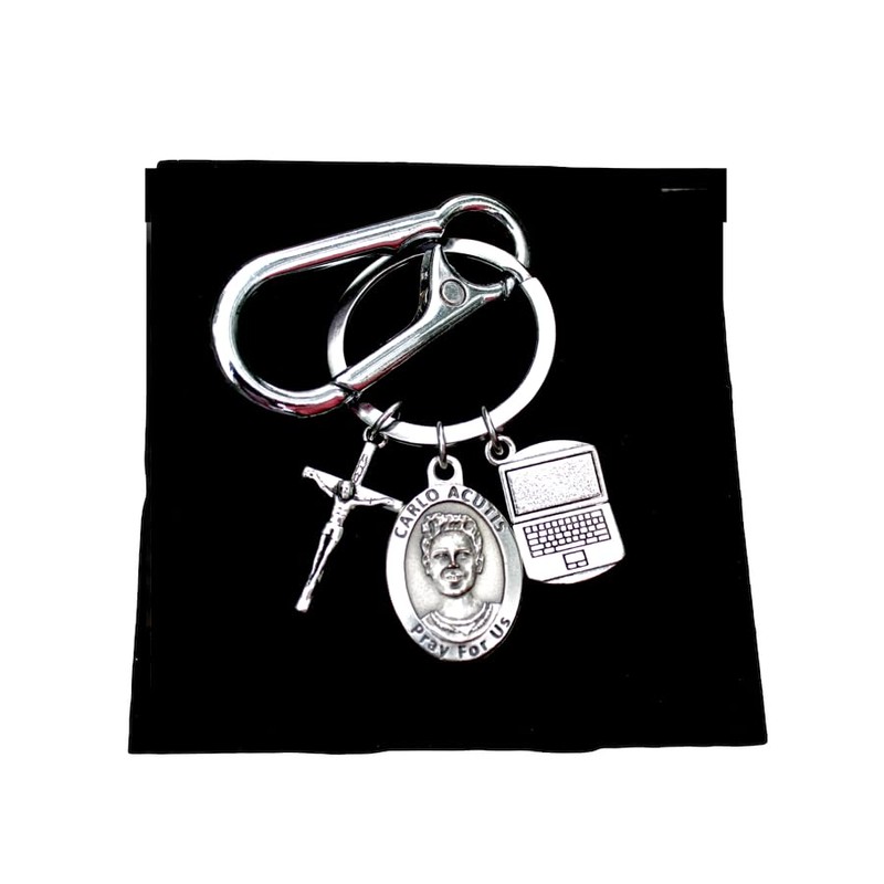 Blessed Carlo Acutis, Laptop and Crucifix Charm Keychain, Confirmation Gift, Patron Saint of Gamers, Eucharistic Miracles