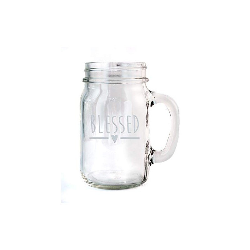 Blessed Typography Etched Glass 16 Ounce Mason Handled Jar Mug Glassware Gift