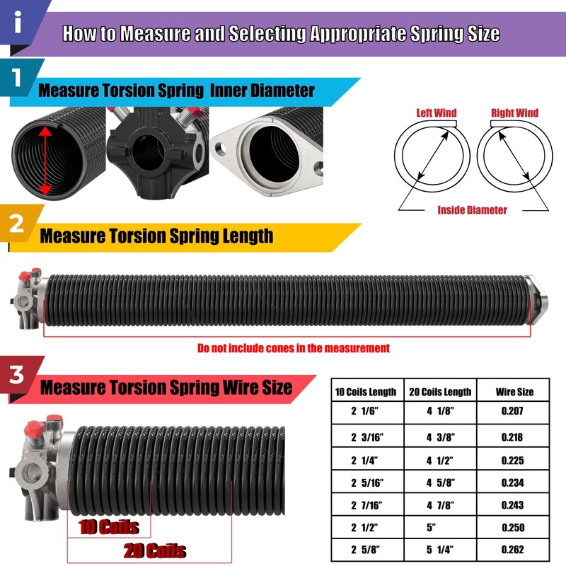 - Package Includes: A set of Garage Door Torsion Springs (Left & Right), two 17.2'' Non-Slip Winding Bars, anti-slip Gloves, and an Installation Instruction sheet.
