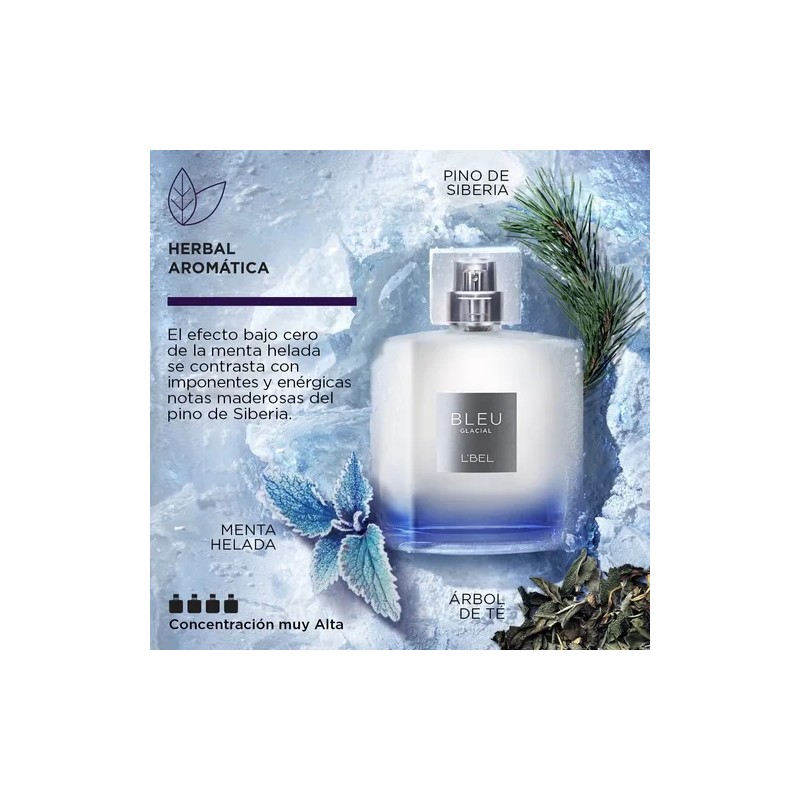 Bleu Glacial de L'Bel es una fragancia diseñada para el hombre moderno que busca una sensación de frescura y vitalidad. Su composición única combina notas mentoladas y amaderadas, creando un aroma enérgico y refrescante.fragrantica.es