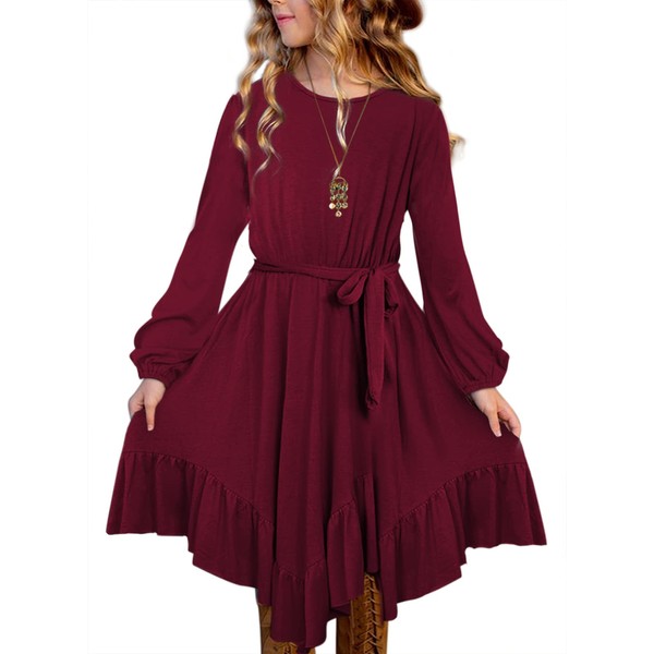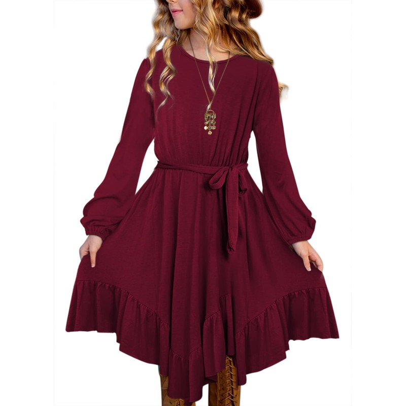 blibean Girl Fall Boho Dress Kid Long Sleeve Tween Bohemian Burgundy Round Neck Child Dresses Solid Maxi Flowy Swing Clothes Size 4-5T Small Wine Red