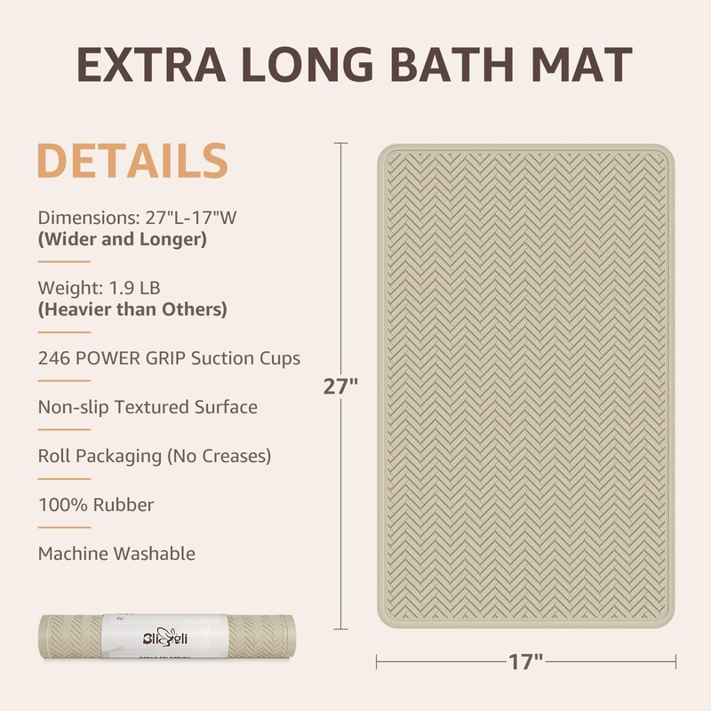 - Long XL Size For Bathtub: Extra long and large, XL size is at 27x17 inches. It covers most of the bath tub. It’s also heavier and thicker than other mats. Great for homes, hotels, hospitals, assisted living facilities, gyms, saunas, spas and showers