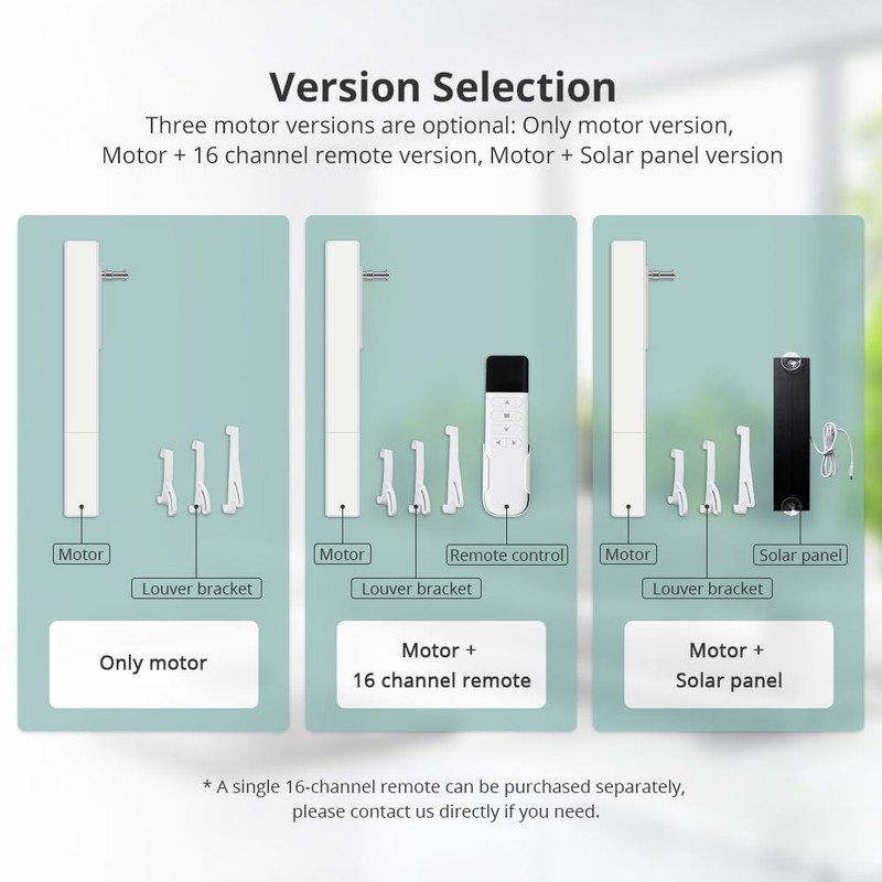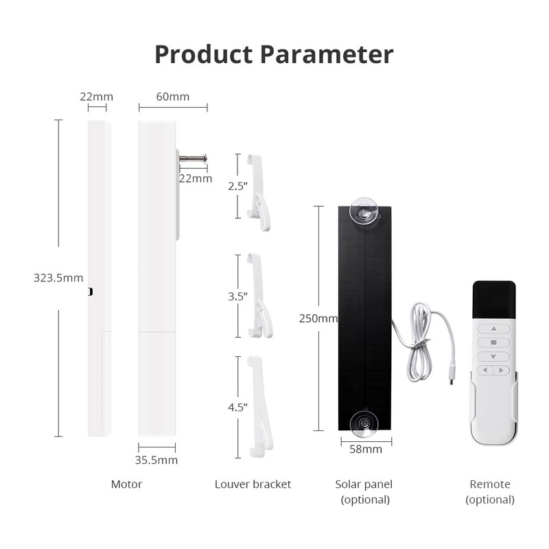 - Packing List: 1 x Plantation Shutter Opener (Zigbee or Remote version); 1 x User Manual; 2.5",3.5",4.5"Louver Brackets in 3 sizes; 1 x Optional Solar Panel (if selected); 1 x Remote (if selected)