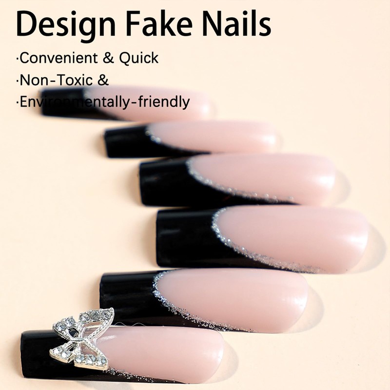 • Package Contents: Package with 24pcs cute long coffin square bling butterfly rhinestone charms black french tip press on nails with glitter designs,24pcs jelly glue stickers,1pc nail file,1pc wooden stick.Difference sizes artificial nails can repeated use,you can trim it to any length you want,no need to buy other things,you can get acrylic press on nails
