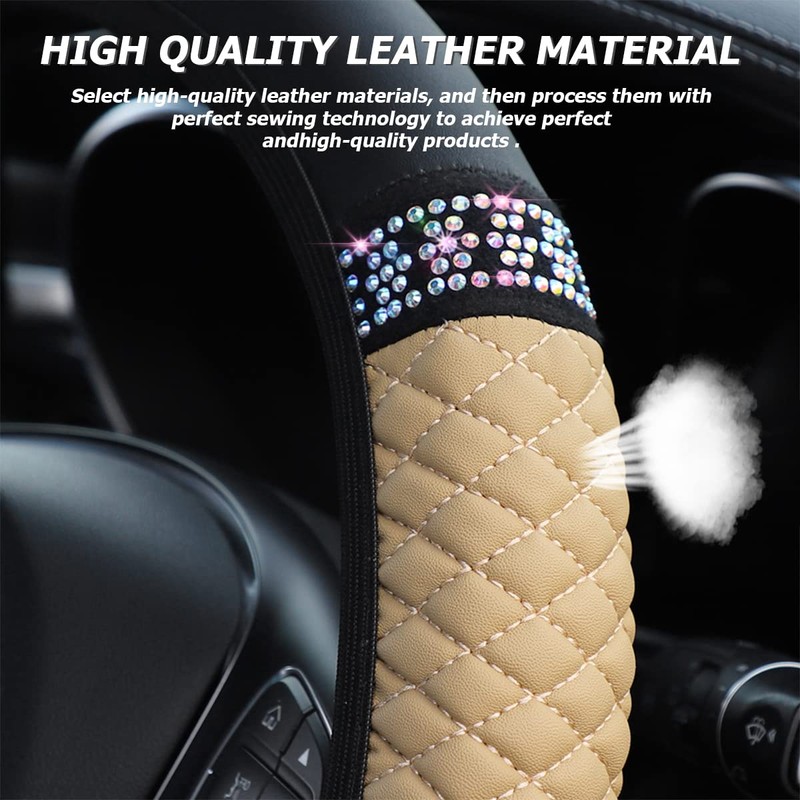 - 【PU Leather & Rhinestones】: Our steering wheel protectors are made of soft PU leather and high gloss rhinestones. The durable leather is very non-slip, stable and comfortable, giving you a great feel in your hands. Rhinestones are set in the strongest setting, which not only won't fall off, but also shines brightly in the light.