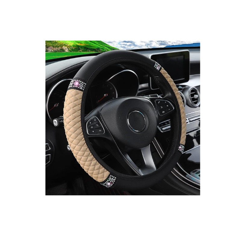 Bling Leather Steering Wheel Cover, Colorful Rhinestones Elastic Steering Wheel Protector, PU Soft Leather with Crystal Diamond, Sparkling Car Accessories for Most Cars (Beige)
