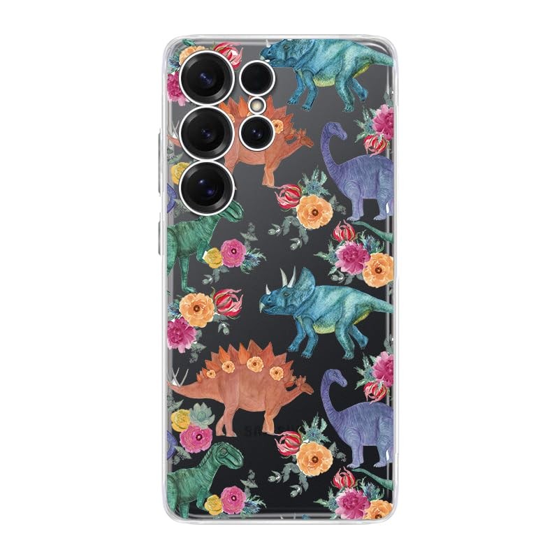 Blingy's for S25 Case, Fun Dinosaur with Flowers Design Cute Cartoon Animal Style Transparent Soft TPU Protective Clear Case 6.9 Inch (Floral Dinosaurs, S25 Ultra)