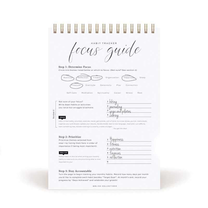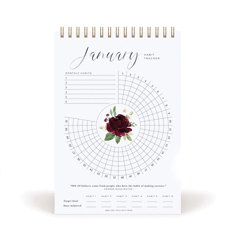 Bliss Collections Habit Tracker Calendar Notepad, Gold Spiral Bound Botanical Floral Journal to track progress and reach your goals - Undated 12 month Journal