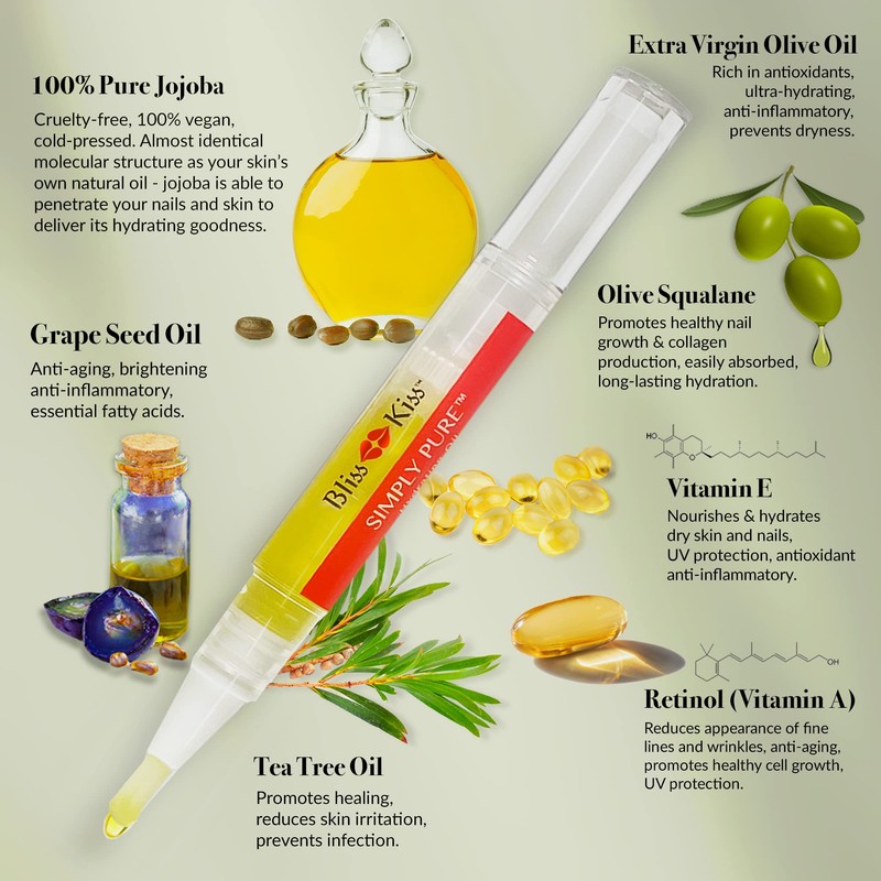 - Feeling Hopeless? If you’ve tried other nail strengtheners and nail growth treatments and been disappointed, you’ve finally come to the right place. Bliss Kiss nail and cuticle oil is hand-made with love and backed by nail science. No water. No dyes. No parabens. No preservatives. No mineral oil. No gluten. No almond oil. No fillers. No kidding. Each Simply Pure nail oil cuticle pen is hand-made with love in the USA since 2012. Remember, Bliss Kiss is best for instant relief & lasting success.