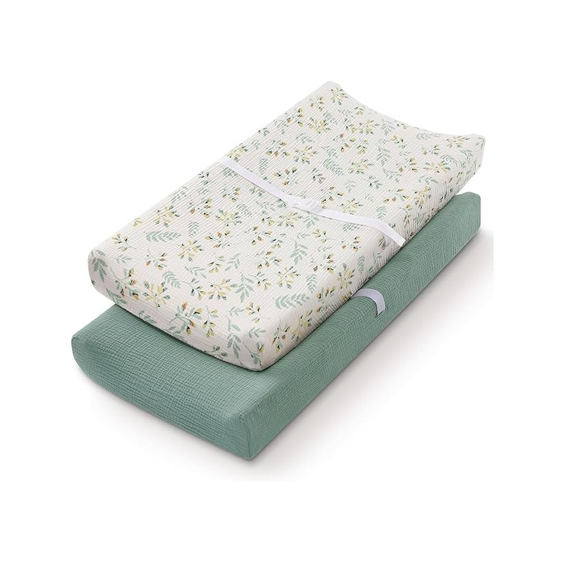 Blissful Diary Muslin Changing Pad Cover for Girls Boys, Ultra Soft Breathable Cotton, Baby Diaper Change Table Pad Covers, 2Pack (Roman Green&Leaf)