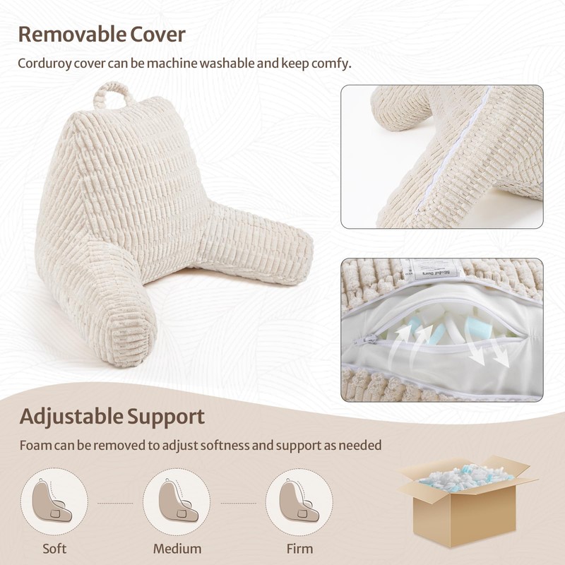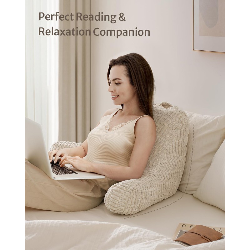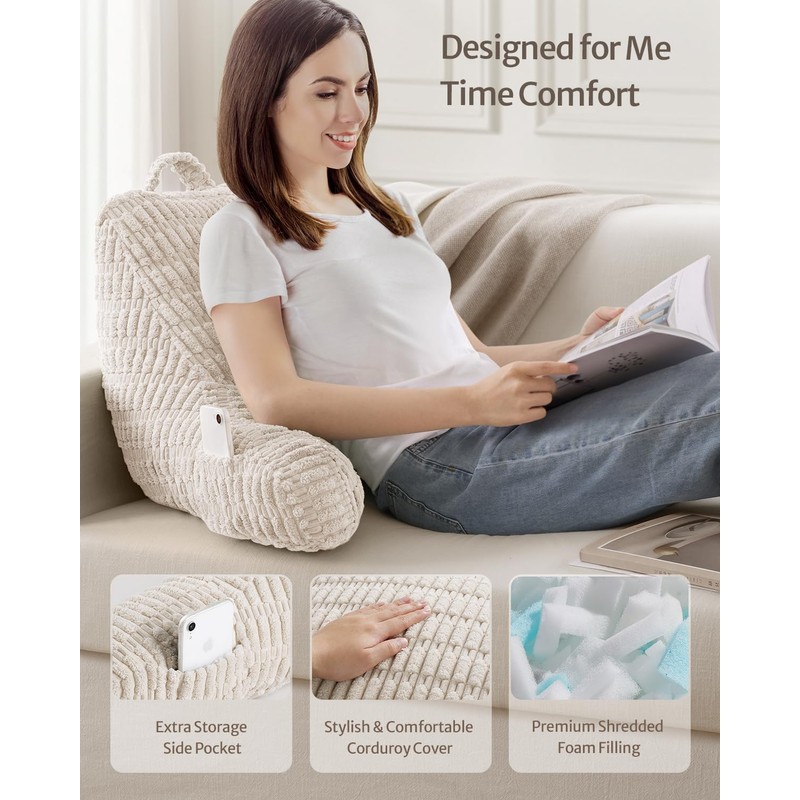Blissful Diary Reading Pillow, Backrest Pillow with Shredded Memory Foam for Adult & Children, Designed for Bed and Couch Sitting Up, Includes Arms, Pockets and Washable Cover, Off White