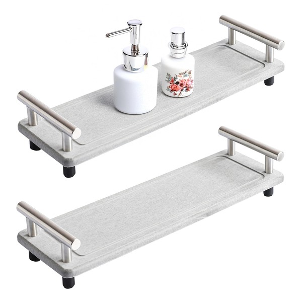 BLISSJU 2Pcs Instant Dry Sink Caddy, Water Absorbent Diatomite Tray for Sink, Stone Drying Tray with Metal Handle, Keeping Kitchen and Bathroom Tidy and Clean (Light Grey & Silver Handle, Small)