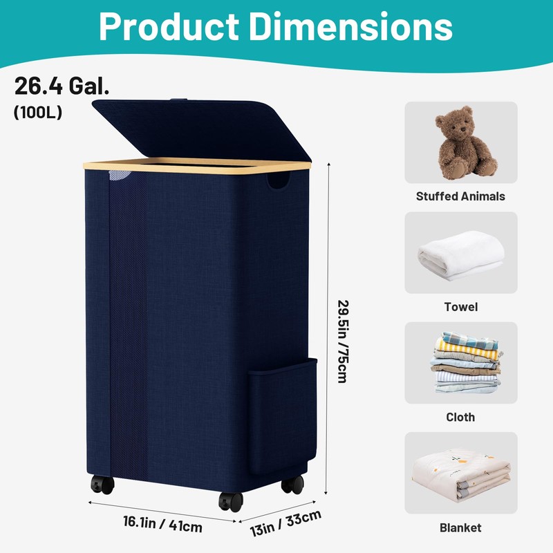 BlissTotes Laundry Basket Laundry Hamper with Lid, Collapsible Laundry Hampers, Laundry Bin, Clothes Hamper Basket with Internal Support & Wheels & Handles for Bathroom, Bedroom (100L, Navy Blue)