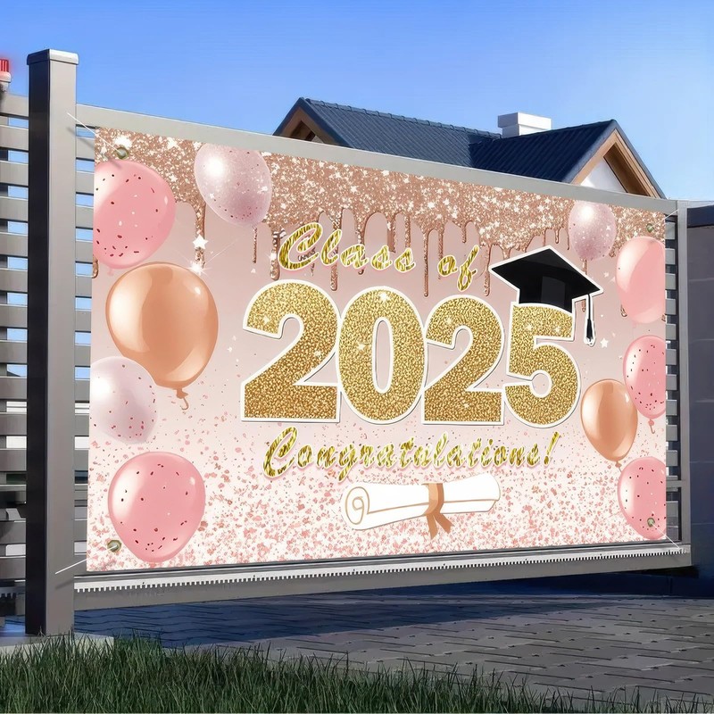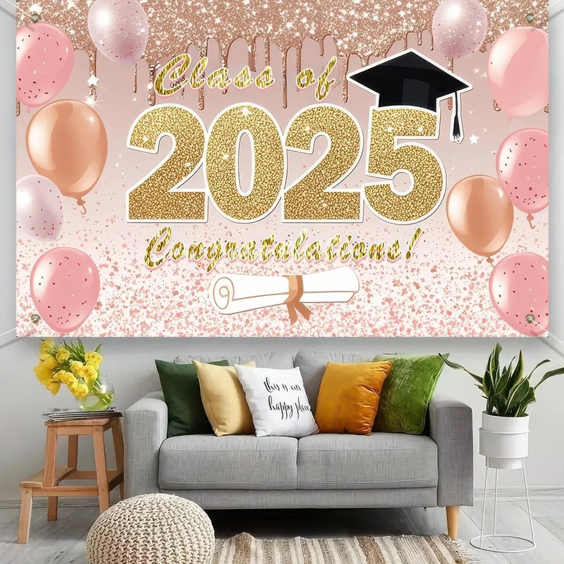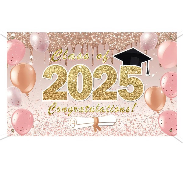 - 【2025 Graduation Decoration】This pink and gold graduation banenr combines various graduation elements, it is a decoration to congratulate the graduation of the class of 2025. The banner is printed with the words "Class of 2025 Congratulations", very clear and eye-catching, add balloons, gifts, flags, can be used for graduation party backdrop banner decorations, add a graduation atmosphere to your party!
