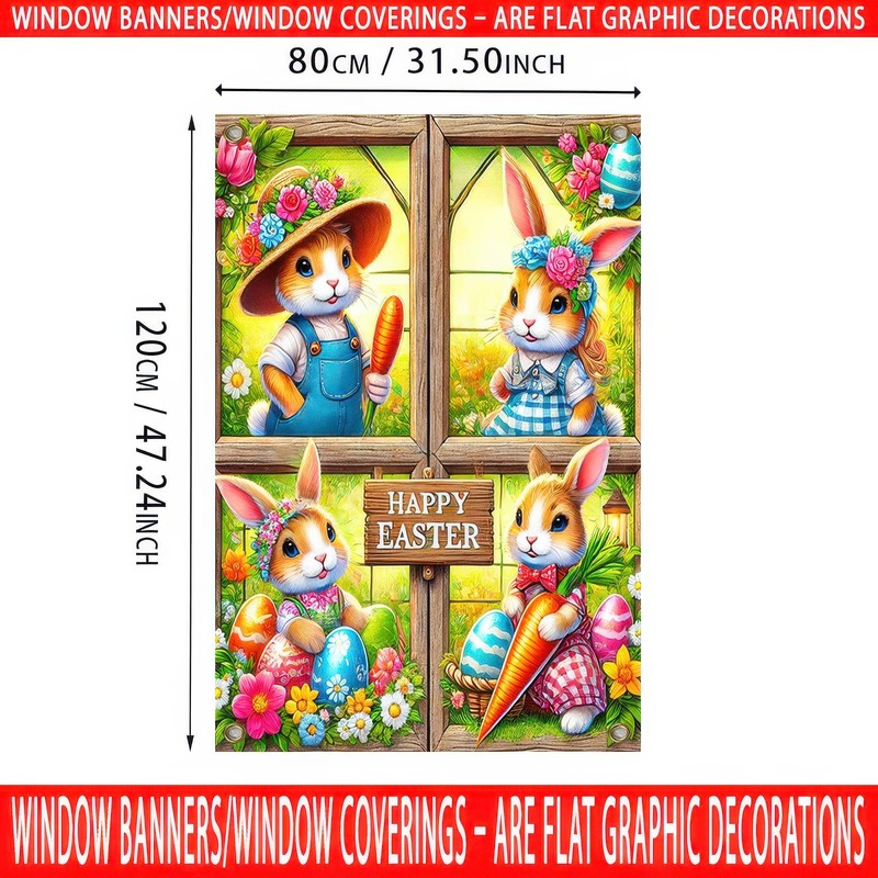 - 【Polyester Material】Easter Bunny Window Cover is crafted from smooth polyester fabric, showcasing bright and festive designs that bring your space to life. The lightweight material makes it easy to hang and perfect for seasonal displays.