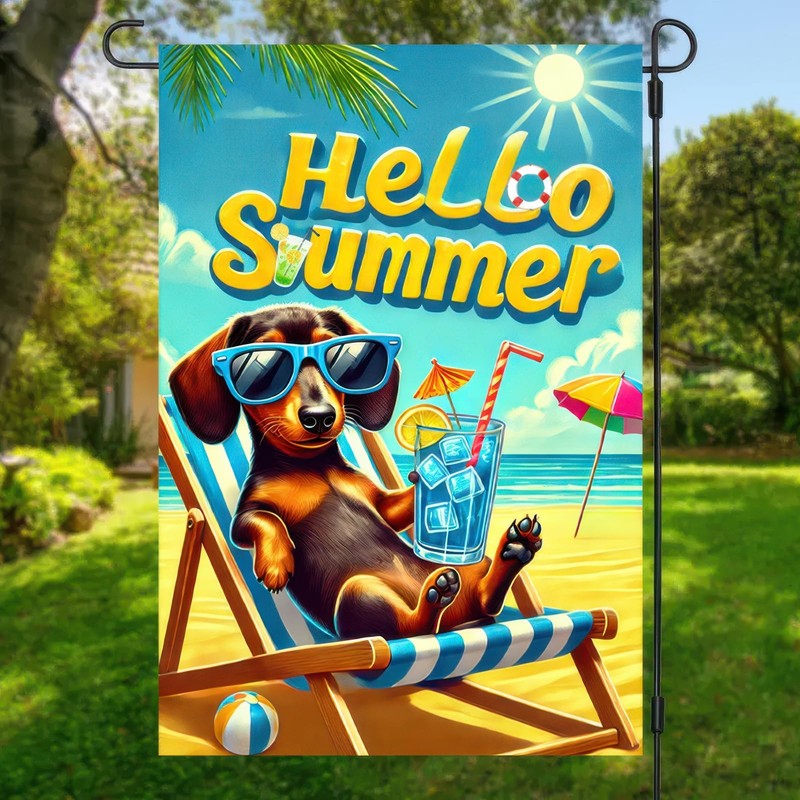 - Hello Summer Garden Flag: Crafted from Polyester, the Hello Summer Sea Beach Dogs Garden Flag is resistant to weather and fading, ensuring vibrant colors for multiple seasons. Reinforced with high-strength double stitching for added durability.