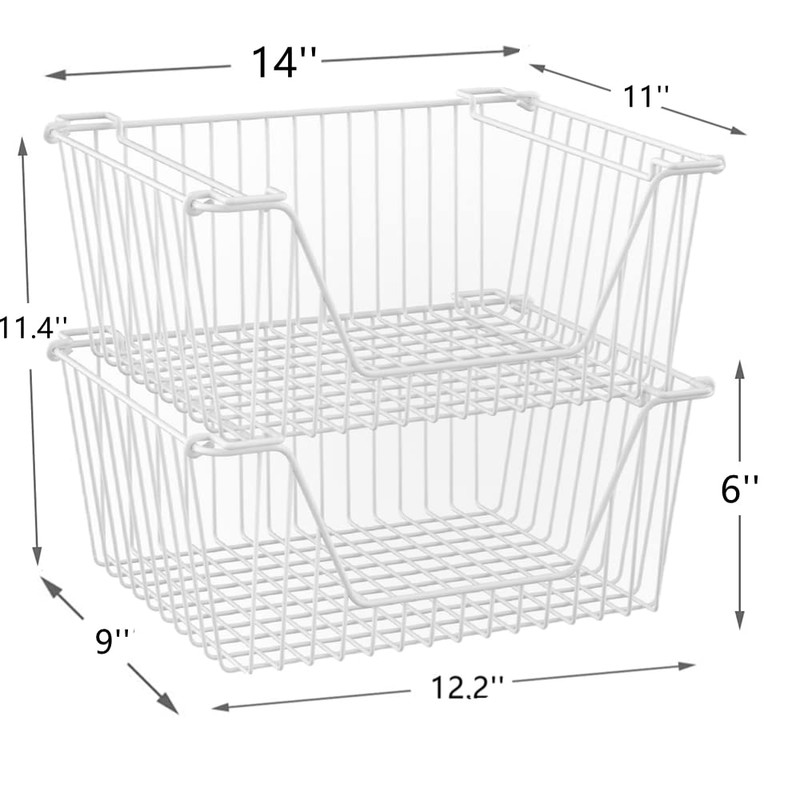 - Open-front design Keeps items organized and easy access within reach. Handles fold inward to stack basket on another one, making vertical storage possible and create space-saving in kitchen spaces.