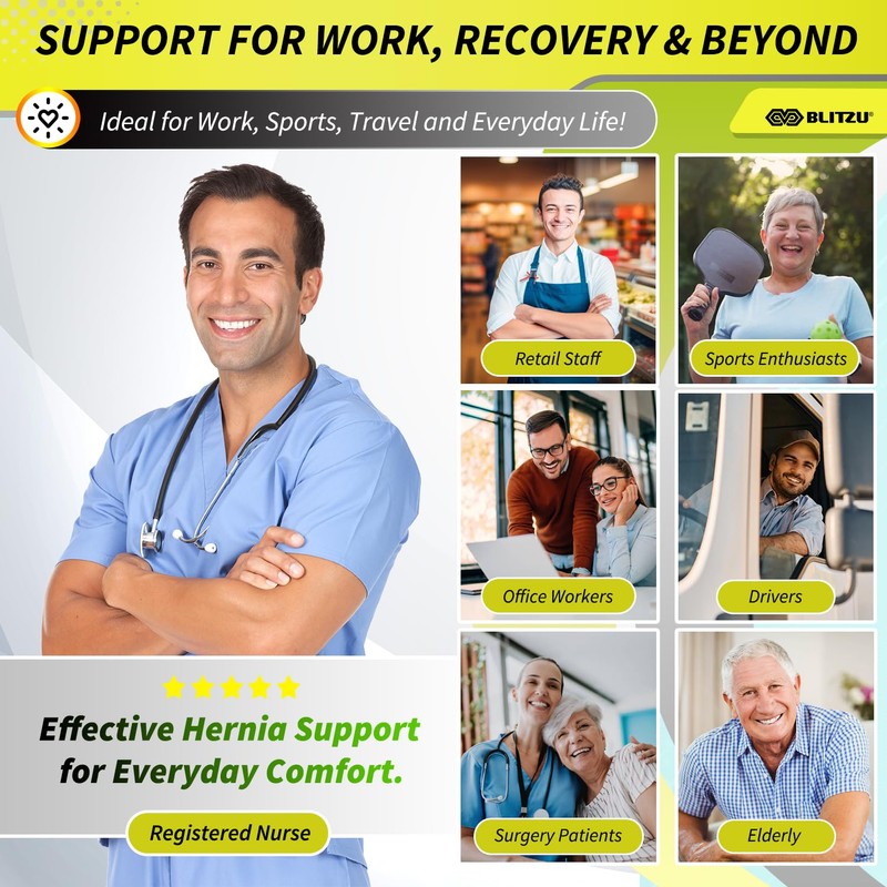 - Instant Umbilical, Femoral & Inguinal Hernia Relief: Do not let your hernia slow you down! Our low profile umbilical hernia belt for men and women provides effective pain relief and comfort before or after hernia surgery. We designed our hernia support belt to add compression to the affected area, reduce discomfort, aid recovery and maintain a comfortable lifestyle with all the support you need.