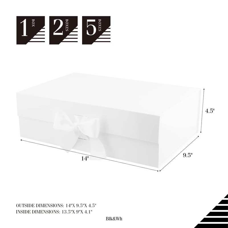 - BLK&WH large lglossy white gift box with ribbon has a concealed and robust magnetic closure which allows the box to be opened and closed repeatedly without any problems. This luxury gift box can hold presents like hankies, souvenirs, cosmetics, gift cards, small candle, perfume and watches and more.