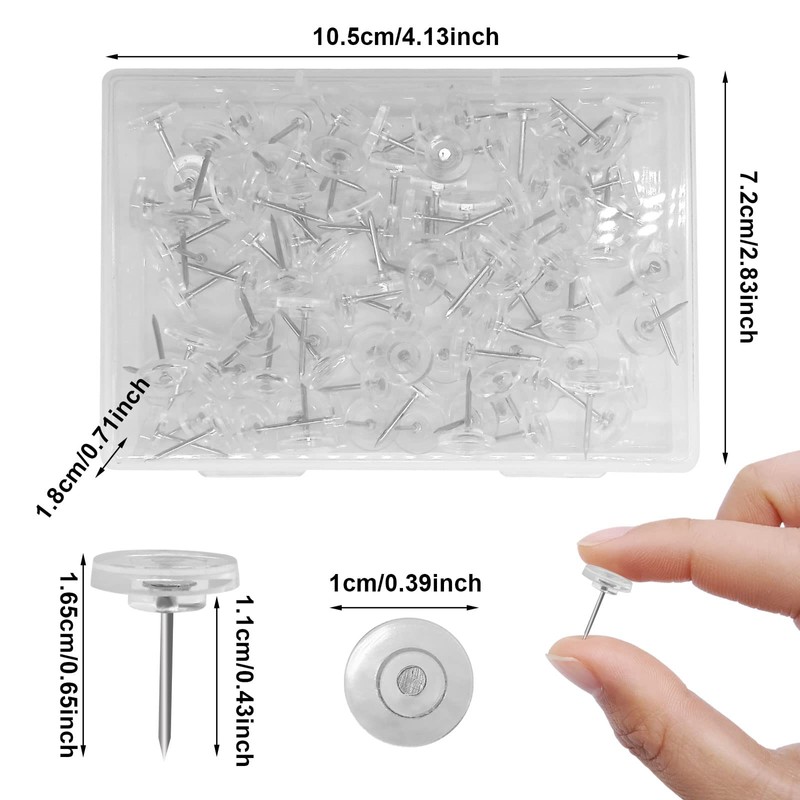 - Enough Quantity: You will receive 100pcs transparent thumb tacks in total. Each measures about 1.1cm/0.43inch in length, 1.65cm/0.65inch in pin head diameter. Enough quantity to meet your needs in fixing paper and pictures on the cork board.