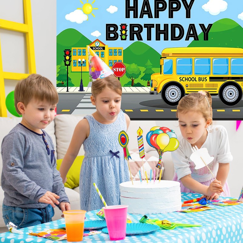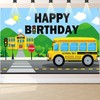BLMHTWO School Bus Happy Birthday Backdrop, Back to school banner, Yellow Bus Party Decoration Banner for Boys Girls Birthday Favor Car Train Theme Party