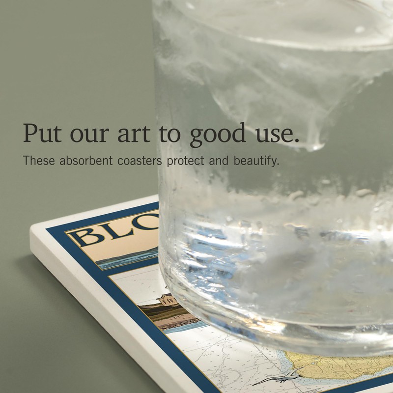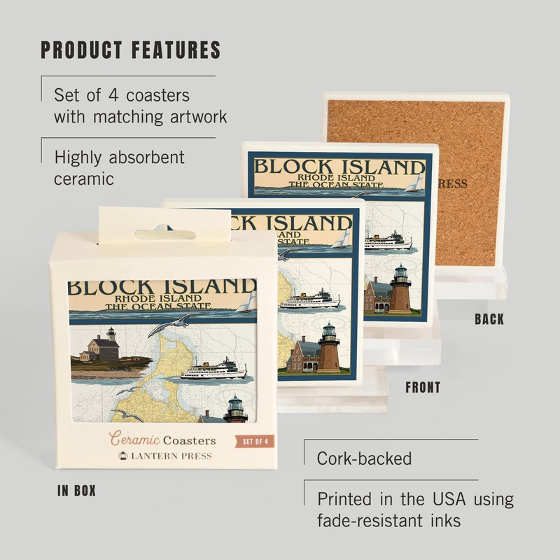 - Block Island, Rhode Island, Nautical Chart with Ferry (Absorbent Ceramic Coasters Set of 4 Matching Images, Cork Back, Kitchen Table Decor), each coaster measures 4x4 inches.