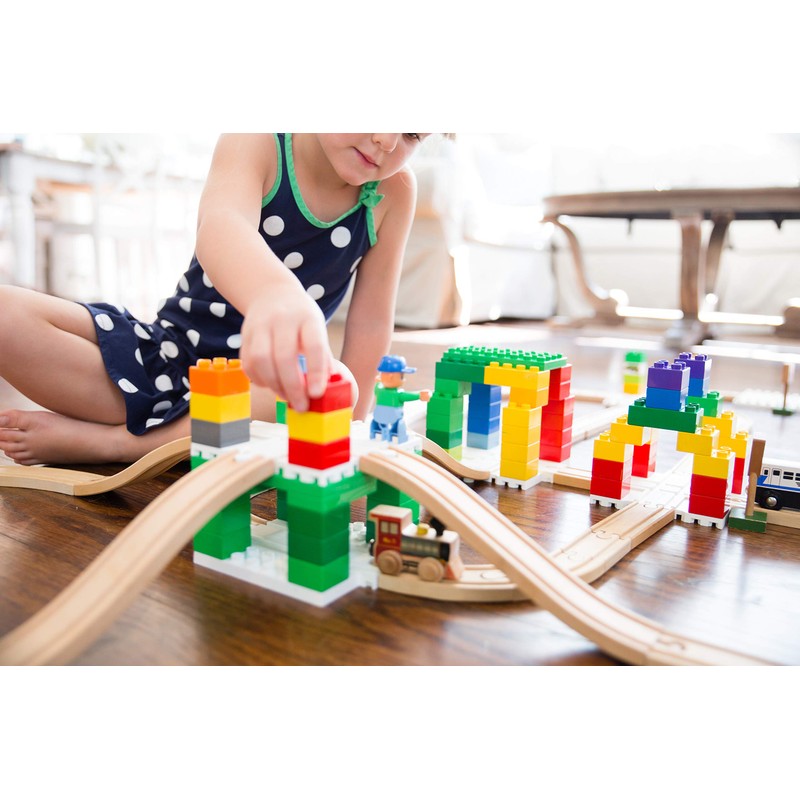 - This top-rated STEM toy combines and connects classic wooden train railways and popular building blocks, bricks (i.e. LEGO DUPLO)