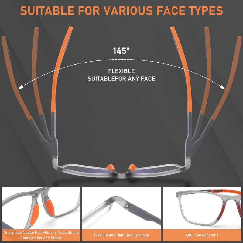 - LIGHTWEIGHT AND COMFORTABLE: Light weight TR90 frame, Sports reading glasses for men women, The nose pads is made of friendly silicone material, which fits the face and anti slip and no redness on your nose, The temple pieces have flexible rubber at the ends which gently hug the head and prevent slipping, make them comfortable to wear for long periods of time
