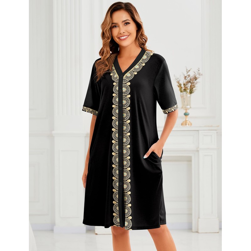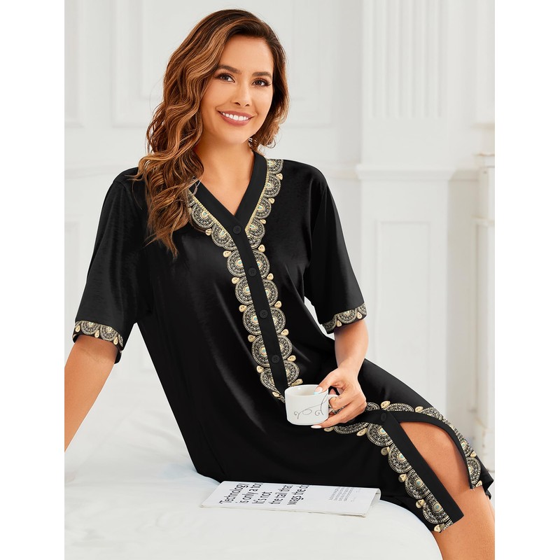 - 【Button Front Housecoat】Long nightgowns for women with pockets fearures button down, allowing you put on or get off without messing up the hair, and facilitate easy nighttime breastfeeding; Classic v neckline gracefully frames your neckline; Relaxed knee length silhouette provides better coverages