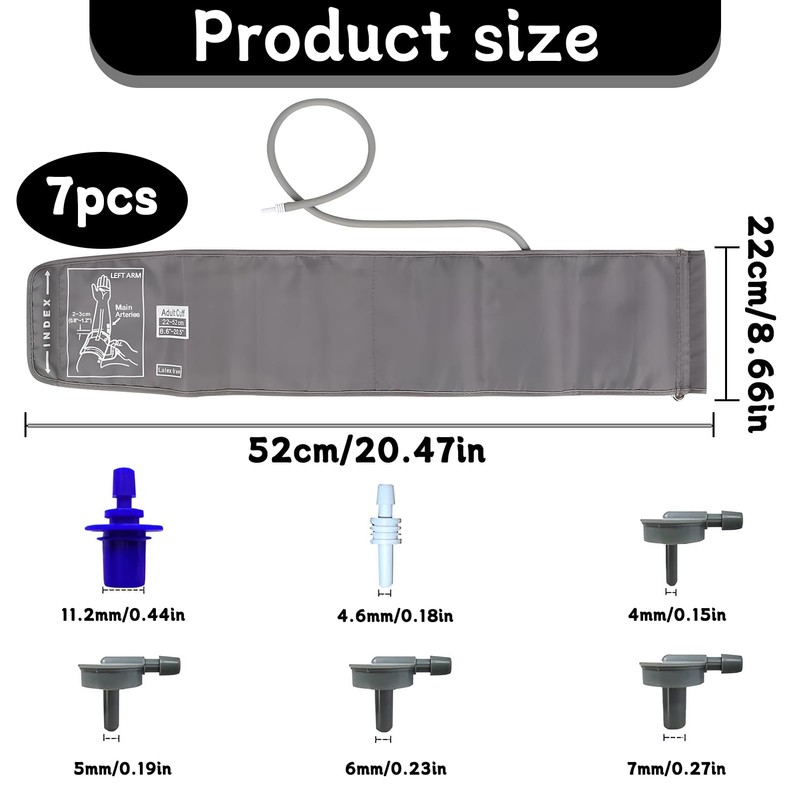 - Compatibility: blood pressure monitor upper arm is equipped with 6 different port sizes (4 mm/4.6 mm/5 mm/6 mm/7 mm/11.2 mm), which are suitable for most brands of blood pressure monitors and have a high compatibility.