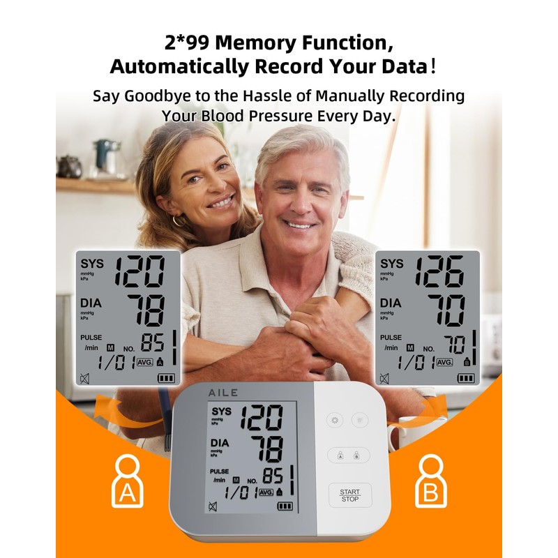 - [Blood Pressure Monitors for Home Use] AILE Automatic Blood Pressure Machine can automatically record you and your whole family menbers' blood pressure values (systolic, diastolic, and heart rate) with a time stamp, it can memery 99 records for each of its two users. You can easily view your measurement history with just one click, and also review it with your doctor