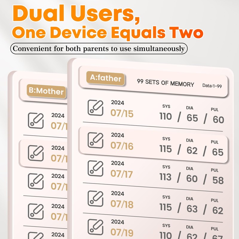 - 【Two Users, Perfect for Families BP Machine】The BP monitor can store data for 2 users, up to 198 records (99 each). It takes 3 readings to find your average blood pressure, giving you a complete health reference. You can track your blood pressure more accurately, using User 1 in the morning and User 2 in the evening. Your health is well taken care of!