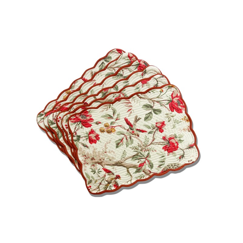 Bloom Collection 100% Cotton Reversible Quilted Placemats (Floral and Bird Design) - Red & White - Set of 6