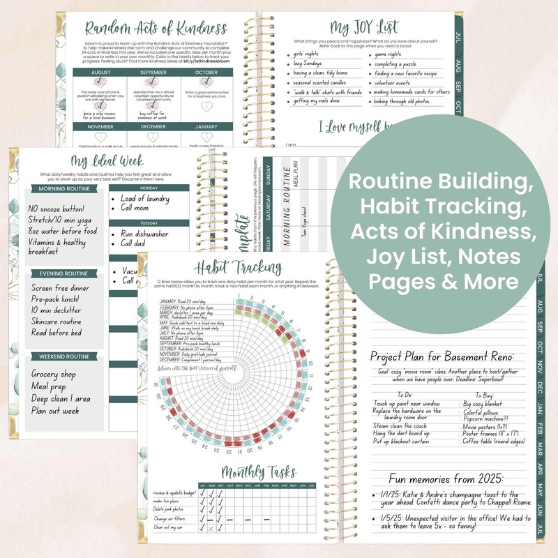 Additional pages include: personal info page with a yearly mission statement prompt, 2025-2026 yearly overview spreads, values page, yearly goal setting, vision board, habit tracking, ideal week planning worksheet, weekly scheduling template, monthly task tracking, monthly spending tracking, 13 notes pages, important dates for next year page, how I bloomed in 2025-2026 page, monthly challenges, inspirational quotes & more!