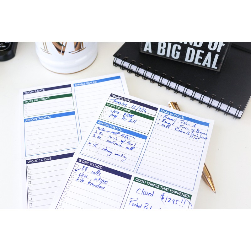 - Fields include (SIDE 1) "Today's Date," "Must Do Today," "Work To Dos," "Emails/Calls," "Good Things That Happened," "To Buy," (SIDE 2) "Personal To Dos," "Big Ideas," "Exercise," "Meals," "Notes" and Water Tracking!